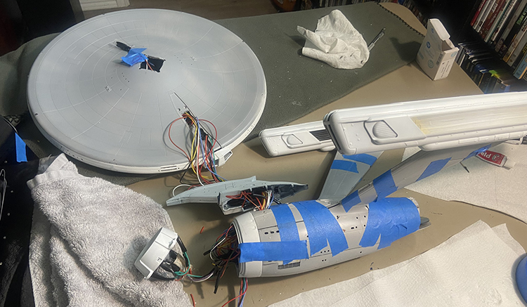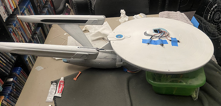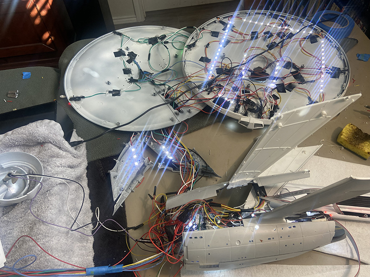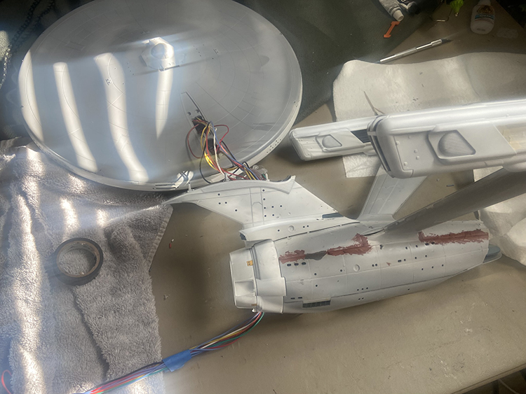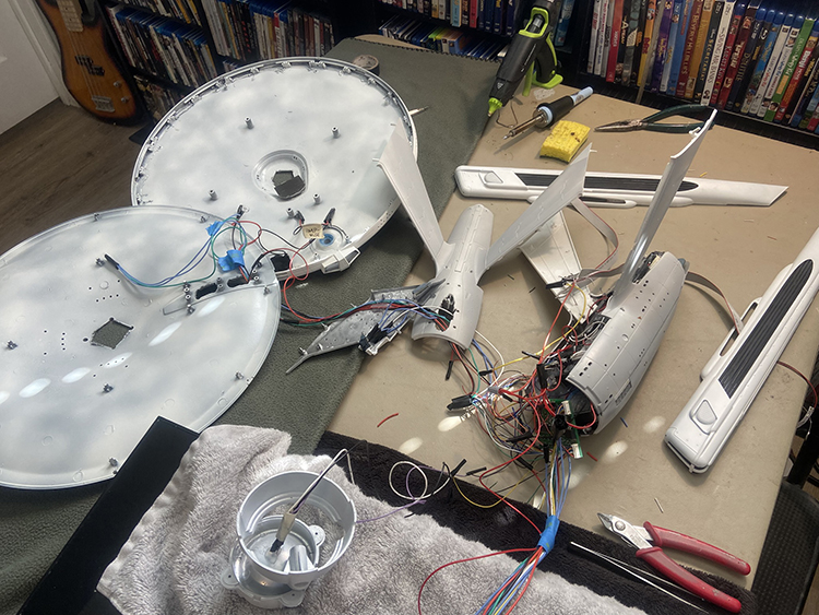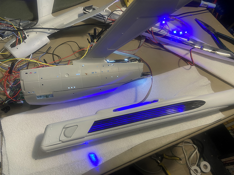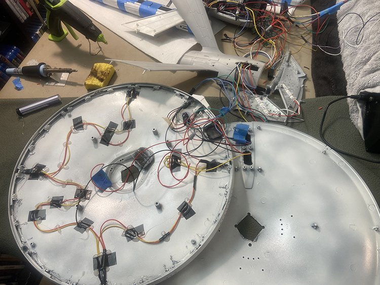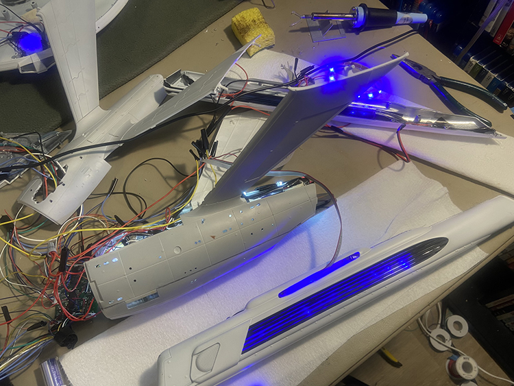 Here's a series of photos... I'm hard at work on the time-consuming process of lighting the model. Unlike the Trekmodeler kit I normally install, I have to follow a wiring diagram and do all the soldering, etc. Each time I add an LED, I plug the power in and check it, then unplug the power, wrap the LED and hot glue it down, then move to the next one. Whew!