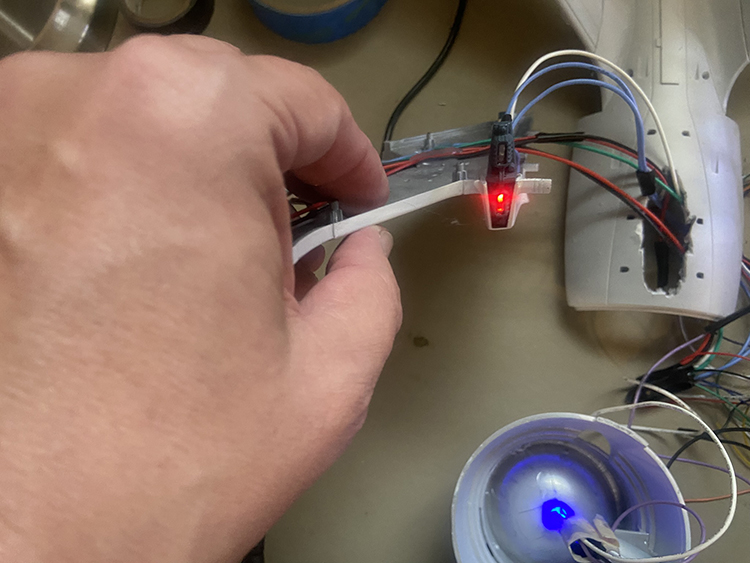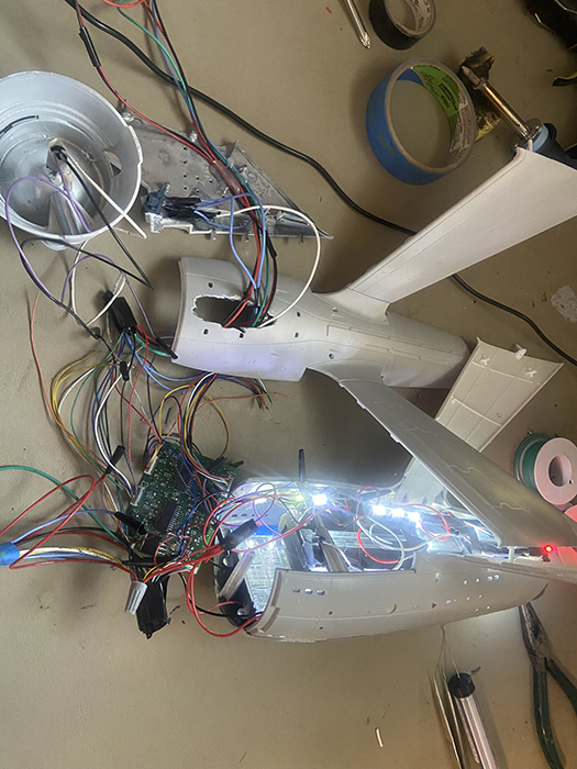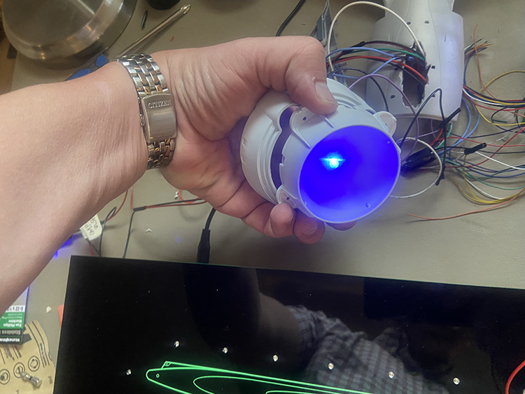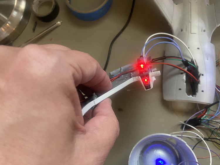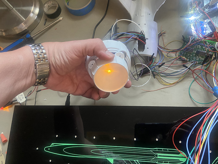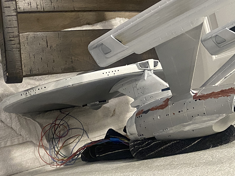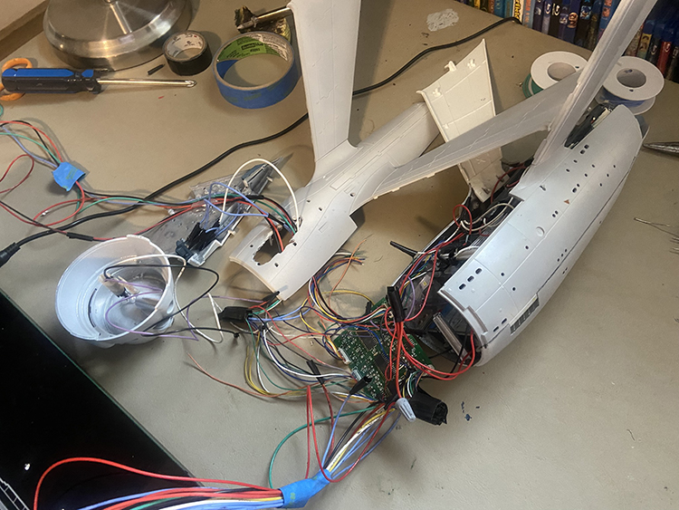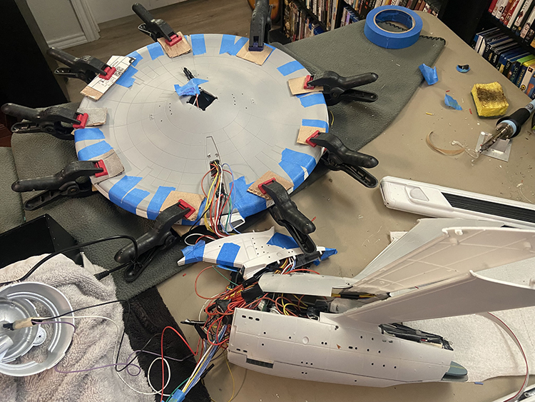 Here's a series of photos... I'm hard at work on the time-consuming process of lighting the model. Unlike the Trekmodeler kit I normally install, I have to follow a wiring diagram and do all the soldering, etc. Each time I add an LED, I plug the power in and check it, then unplug the power, wrap the LED and hot glue it down, then move to the next one. Whew!