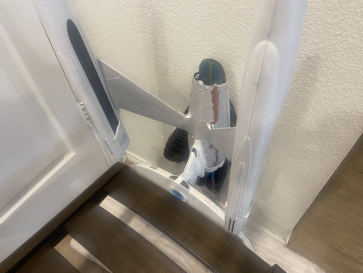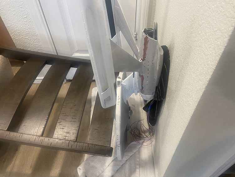 Attaching the saucer. I attach the saucer to the neck with epoxy. It takes several hours to cure. To hold everything in place, I figured out this setup -- propping the ship against the wall using a dining room chair!
