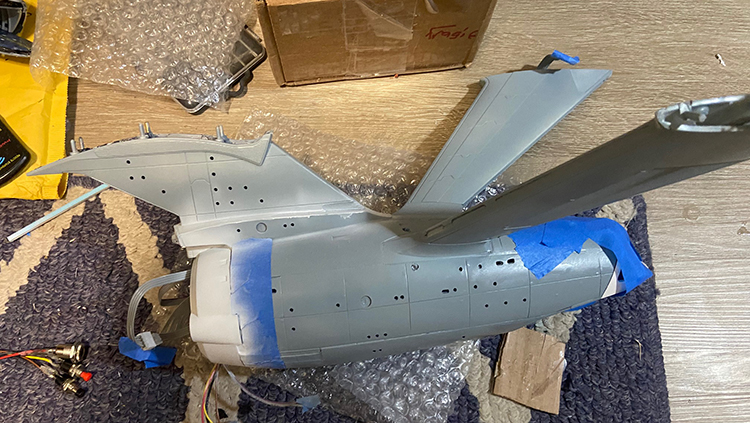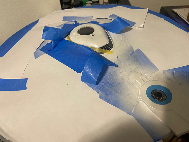 Attaching the hangar doorframe and prepping for Aztec masking to the secondary hull. Painting of Deck B/C on the saucer; next up is lighting.